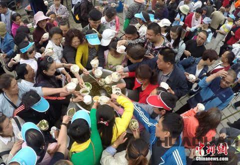 根據(jù)現(xiàn)場描述:5月22日當(dāng)天,道教圣地——欒川老君山的中天門廣場,一塊直徑約5米的“天下 太極豆腐”居中擺放。據(jù)了解,該豆腐是由老君山香客捐贈的谷物制作而成,讓民眾免費(fèi)品嘗。豆腐為圓形,重量4200斤,用去黃豆2000余斤,上面呈現(xiàn)太極圖并寫著“天下 太極豆腐”。當(dāng)?shù)孛袼讚尪垢礊?ldquo;搶頭福”,開吃兩個(gè)多小時(shí)即被游客搶光。現(xiàn)場還配有豆花和調(diào)料汁,讓游客感受欒川豆腐的 魅力。