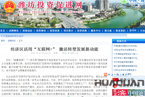 5月11日,山東省濰坊市合作發展促進局旗下的門戶網站——濰坊投機促進網以《經濟區活用互聯網+ 激活轉型發展新動能》未標題,用較大